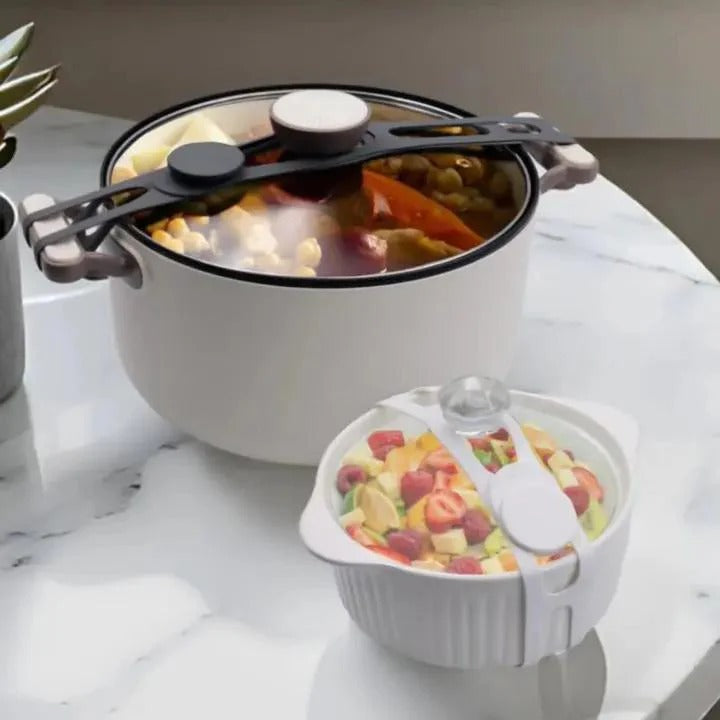 Dieses clevere Silikonband hält Deckel dank eines selbstverriegelnden Knopfsystems sicher an ihrem Platz.