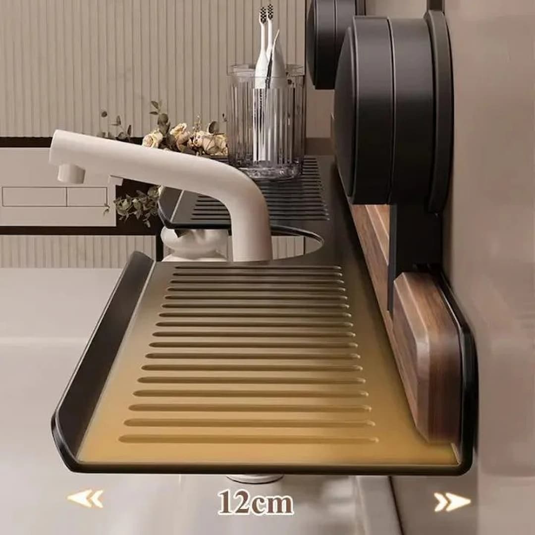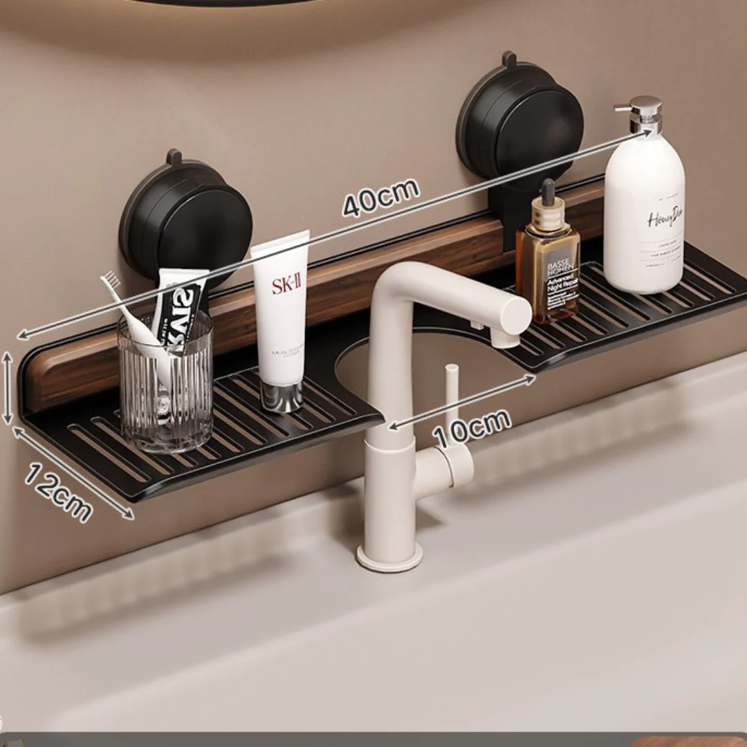 In den meisten Badezimmern und Küchen wird der Bereich um den Wasserhahn schnell zur Ablage für Flaschen, Schwämme und Kleinkram.