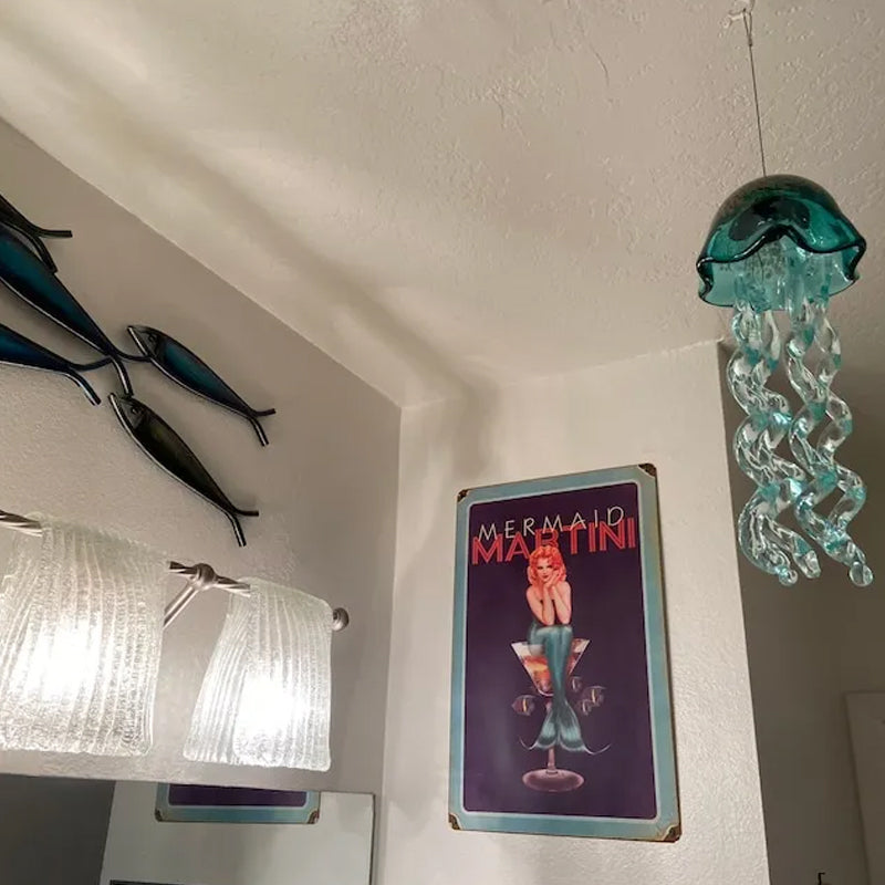 💖Un trou a été percé au milieu pour accueillir les tentacules de la méduse. Quatre tentacules fabriqués à la main sont astucieusement façonnés et colorés. Il s'agit d'une pièce 100% faite à la main et n'a subi aucun processus d'édition. La méduse est soutenue par un câble de suspension de haute qualité pour plus de durabilité et est livrée avec un crochet en laiton pour la suspendre.