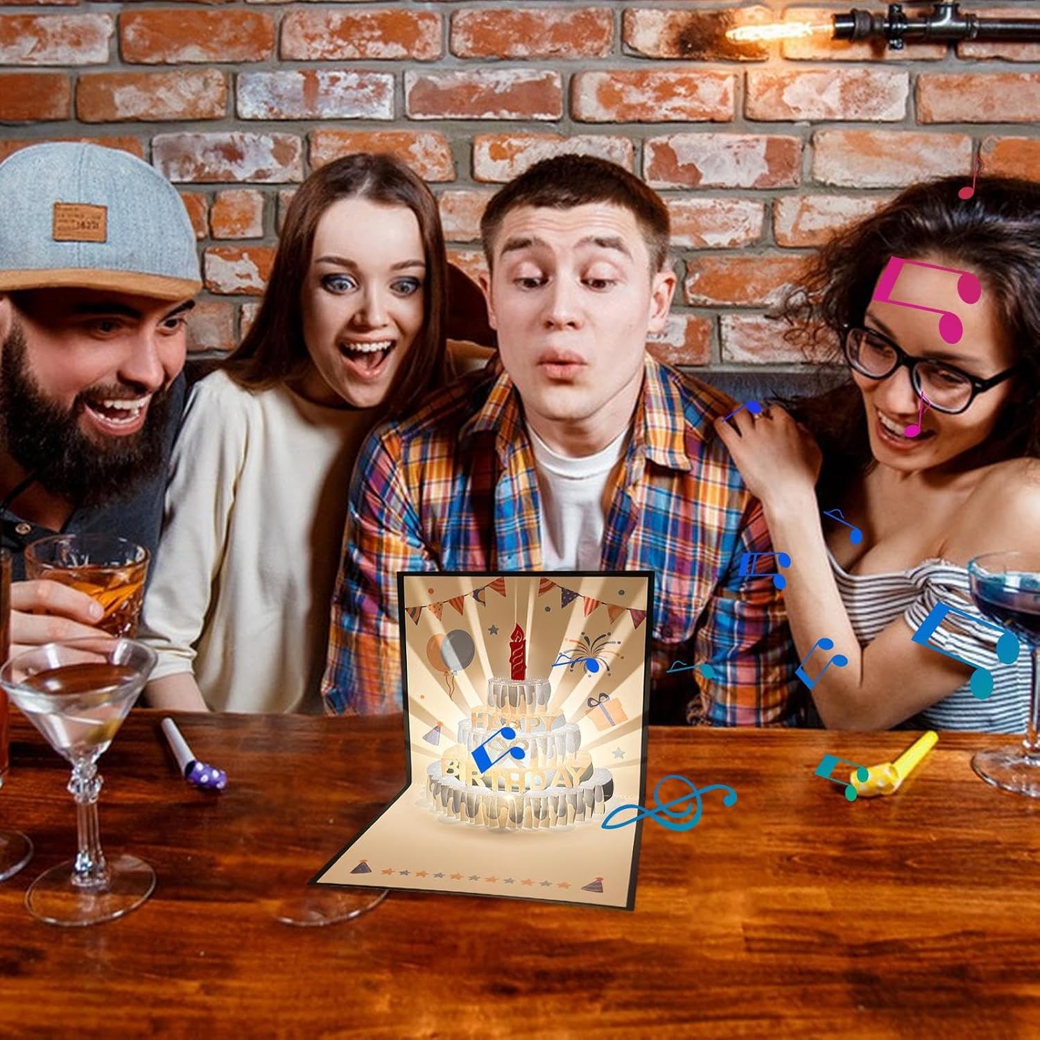 Wenn deine Liebsten den Umschlag öffnen, entfaltet sich die Karte zu einem wunderschönen 3D-Pop-up-Kuchen, der sanft von LED-Lichtern erleuchtet wird und eine fröhliche Geburtstagsmelodie spielt.