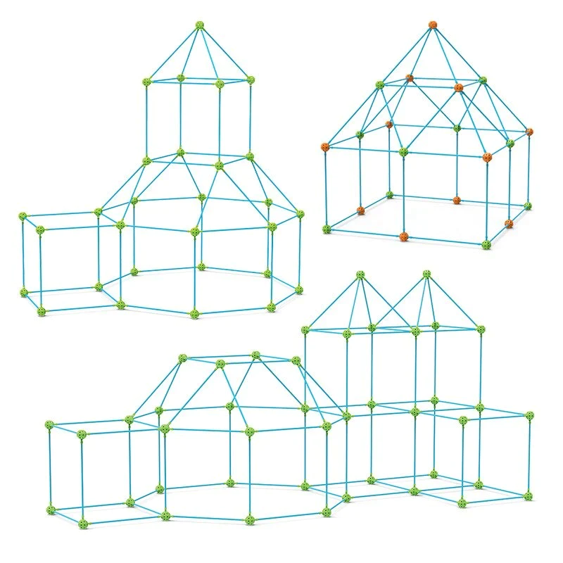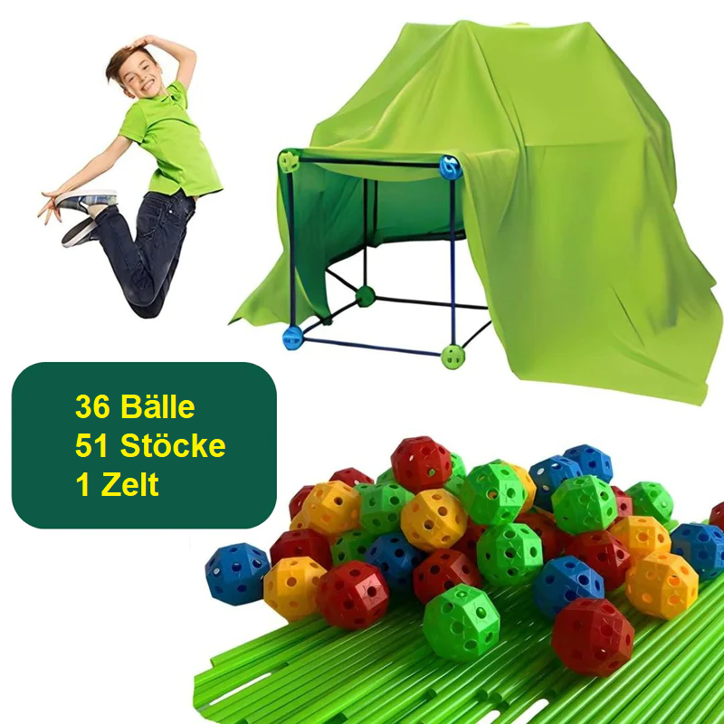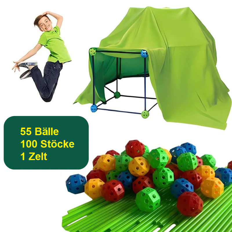 Bauset zum Konstruieren eines Kinder-Spielhauses mit einem farbenfrohen Stecksystem. Das Set besteht aus stabilen Kunststoffverbindern und Stäben, die sich leicht zusammenbauen lassen. Geeignet für Kinder ab 3 Jahren für kreatives Bauen und Spielen.