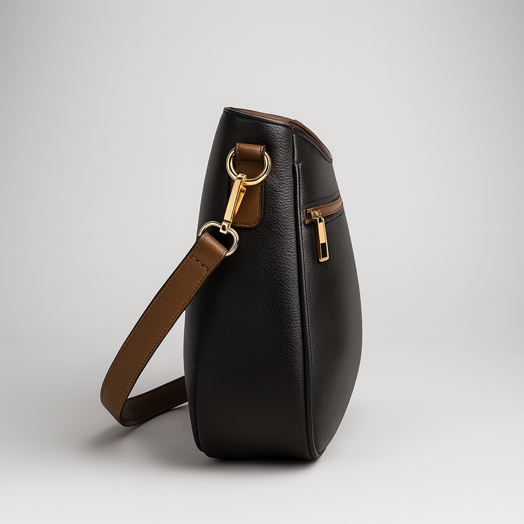 Aus hochwertigem Kunstleder gefertigt, überzeugt sie durch ihre elegante Kombination aus schwarzer Grundfarbe und braunen Akzenten. Der moderne Look wird durch den praktischen Reißverschluss und die goldfarbenen Details abgerundet, die für einen Hauch von Eleganz sorgen.