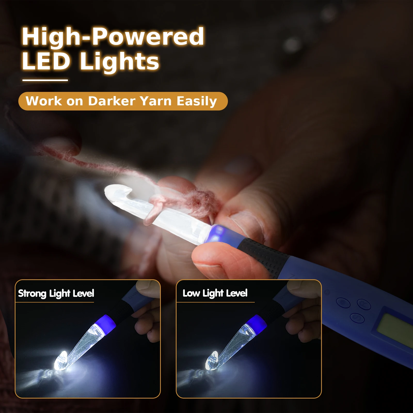 2. Drücken Sie die Taste, um das LED-Licht einzuschalten und mit dem Häkeln zu beginnen.