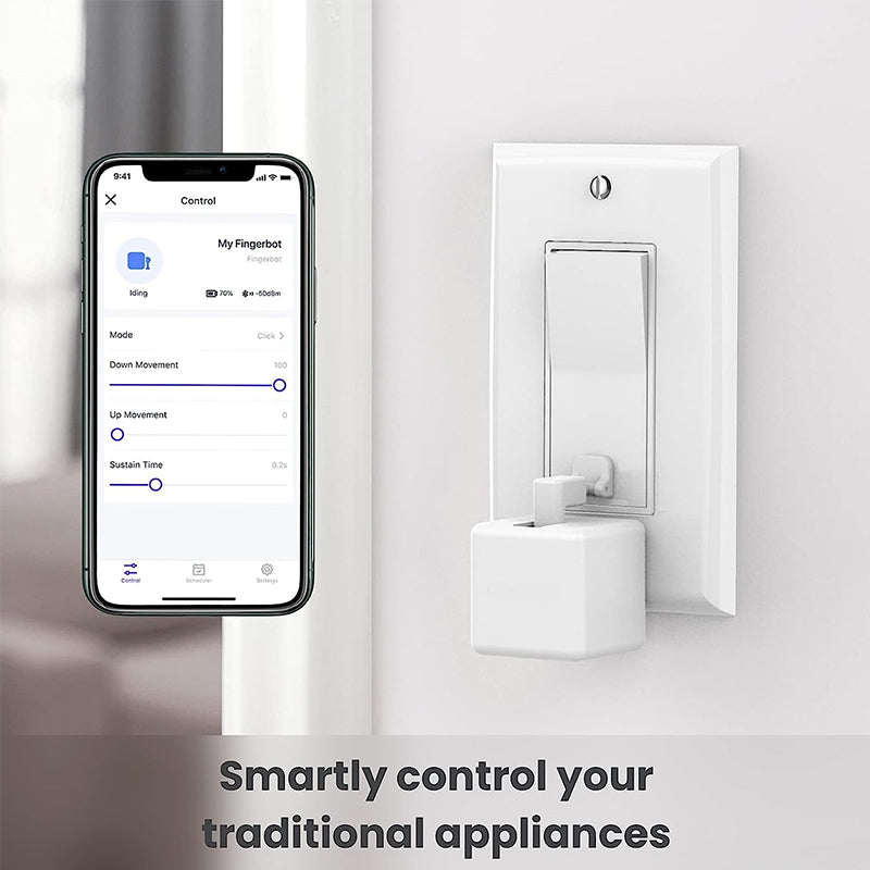 • Automatisierter Zeitplan! Sind Sie es leid, sich Gedanken darüber zu machen, ob Sie das Licht anlassen oder die Geräte laufen lassen, wenn Sie nicht zu Hause sind? Mit SwitchMate können Sie ganz einfach automatisierte Zeitpläne einrichten, um Funktionen entsprechend Ihrem gewünschten Timing ein- und auszuschalten. Egal, ob Sie abends das Licht einschalten oder Geräte vor dem Schlafengehen ausschalten, der intelligente Fingerroboter sorgt dafür, dass Ihre Geräte effizient verwaltet werden, und sorgt so für Komfort, Energieeinsparungen und Seelenfrieden, auch wenn Sie nicht da sind!