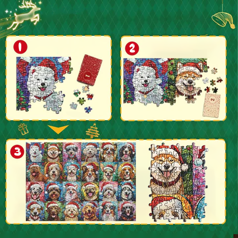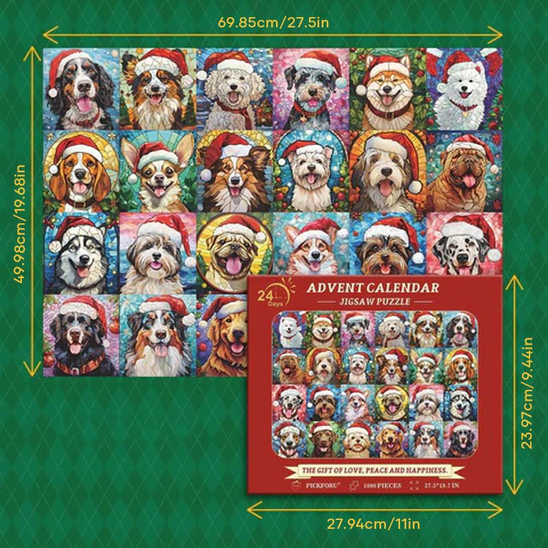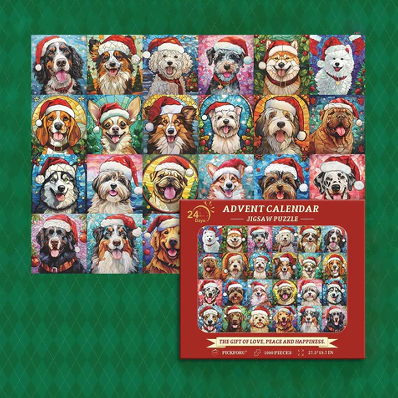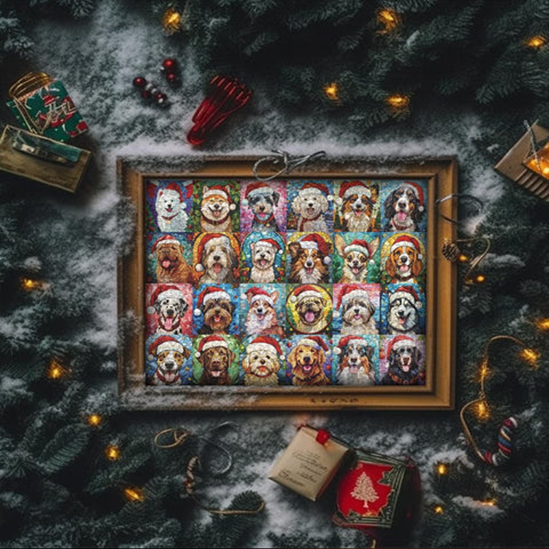 Puzzle Calendrier de l'Avent 2024 : profitez d'un puzzle de vitraux festif mettant en vedette 24 races différentes de chiens en costumes de Noël. Chaque chien a une pose et une expression uniques qui apporteront de la joie et de l'excitation festives pendant que vous vous préparez pour Noël. Un merveilleux cadeau de Noël ou une activité familiale qui promet plaisir et surprises.