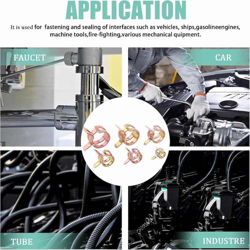 Mit 100 Schellen in 10 Größen (6–22 mm) sind Sie immer bestens gerüstet – egal ob für Autos, Motorräder, Boote, Kraftstoffleitungen, Luftschläuche oder Kühlsysteme.